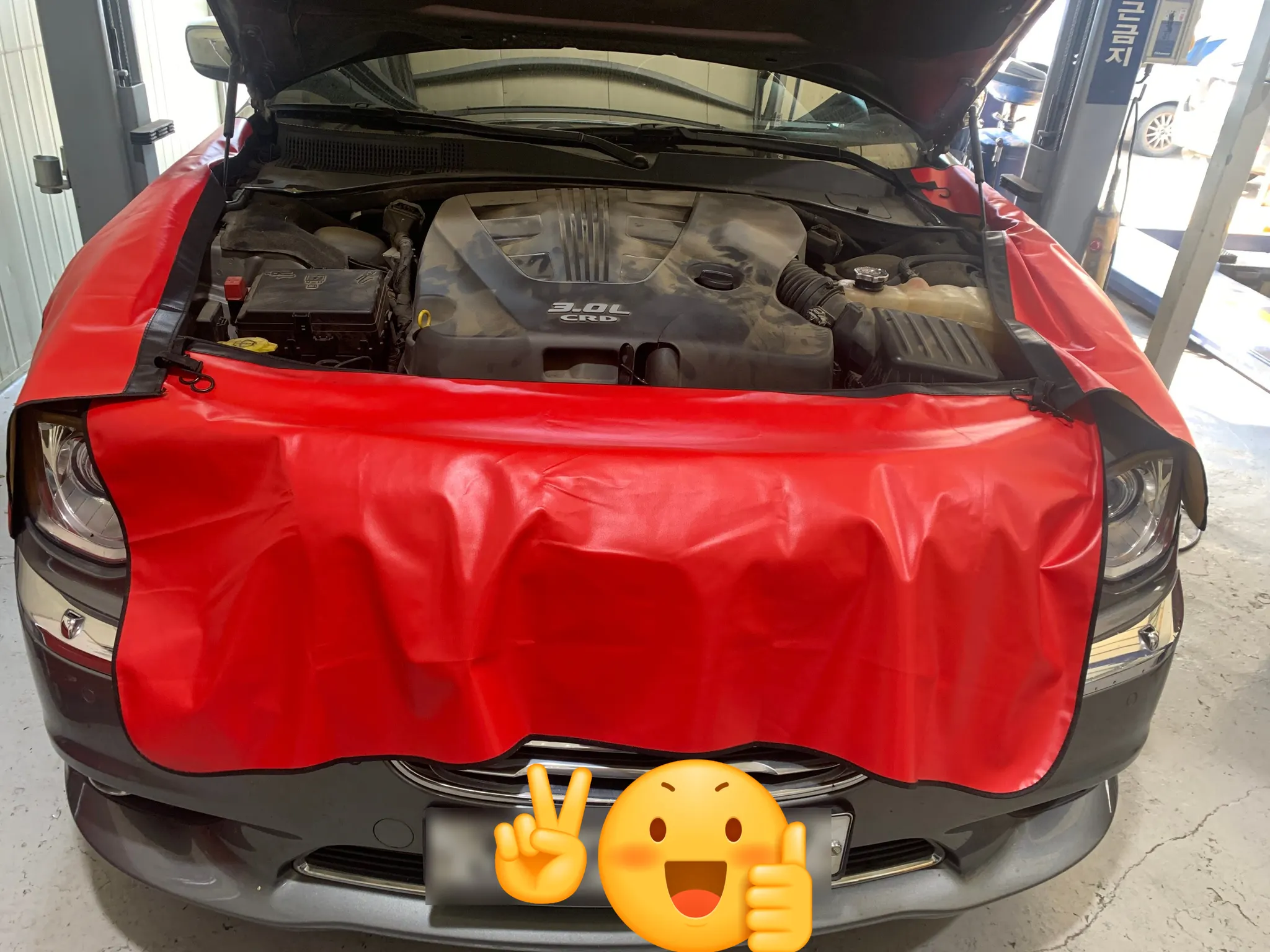 작업시 발생할 수 있는 차량 외부 스크래치를 방지하고자 휀더커버와 전면 커버를 입히고 안전하게 작업을 준비합니다.